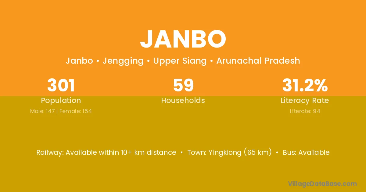 Yingkiong (65 km) is the nearest town to Janbo village for major economic activities and is located approximately 65 km away.