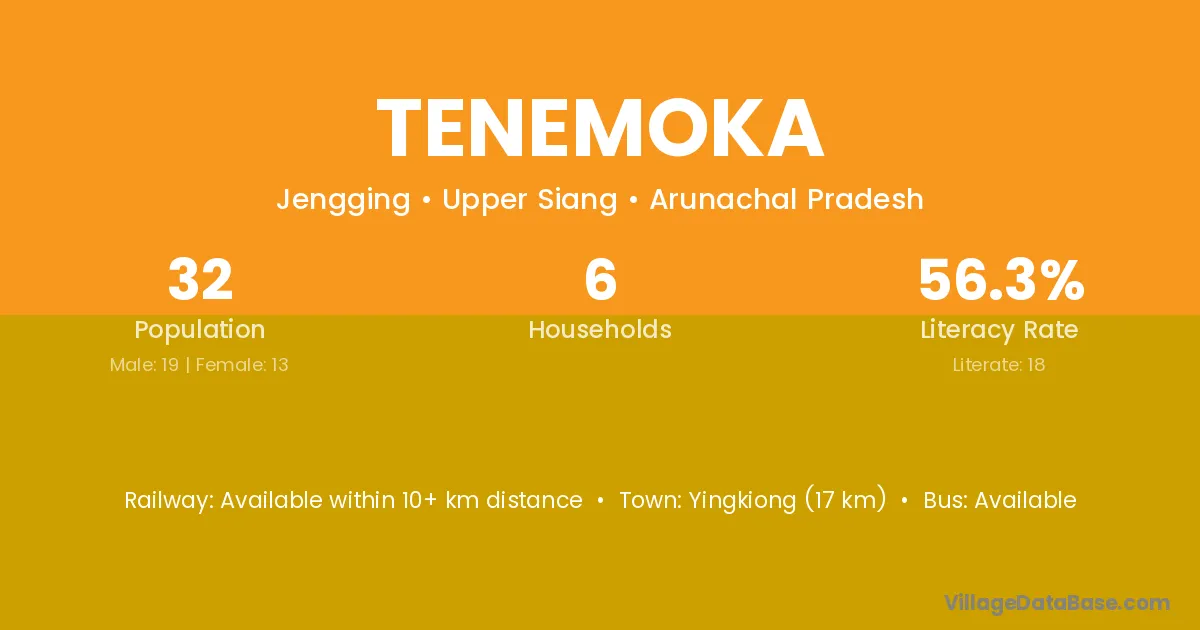 Yingkiong (17 km) is the nearest town to Tenemoka village for major economic activities and is located approximately 17 km away.