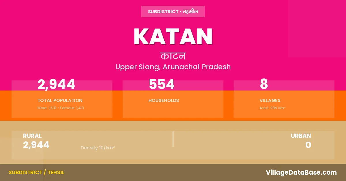 Katan is a town and Circle in the Upper Siang district of the Arunachal Pradesh. In India, a Circle is a subdivision of a district responsible for the administration and revenue collection of a specific area within the district. Circles play a crucial role in the local governance structure, contributing significantly to the development and administration of their communities.