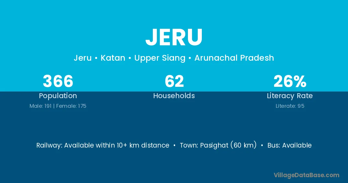 Pasighat (60 km) is the nearest town to Jeru village for major economic activities and is located approximately 60 km away.