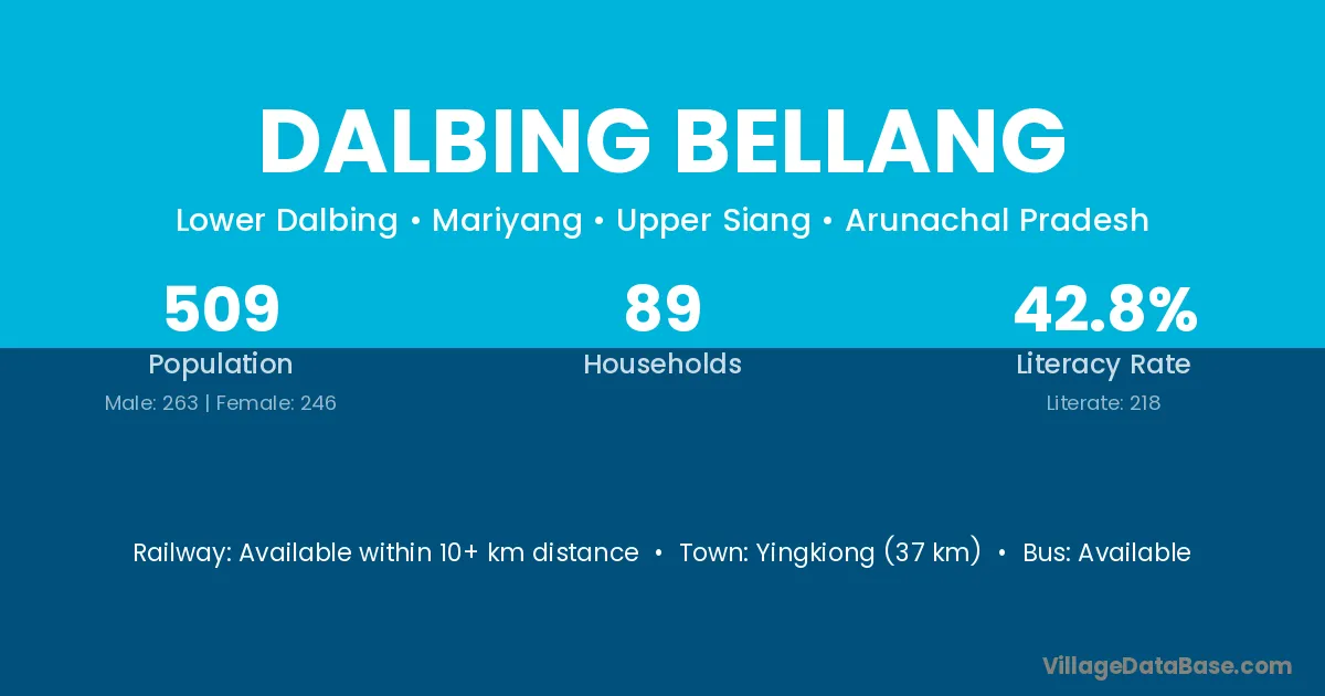 Yingkiong (37 km) is the nearest town to Dalbing Bellang village for major economic activities and is located approximately 37 km away.