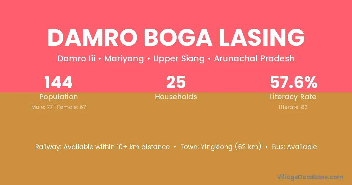 Damro Boga Lasing village has a total population of 144 people, of which 77 are males and 67 are females.