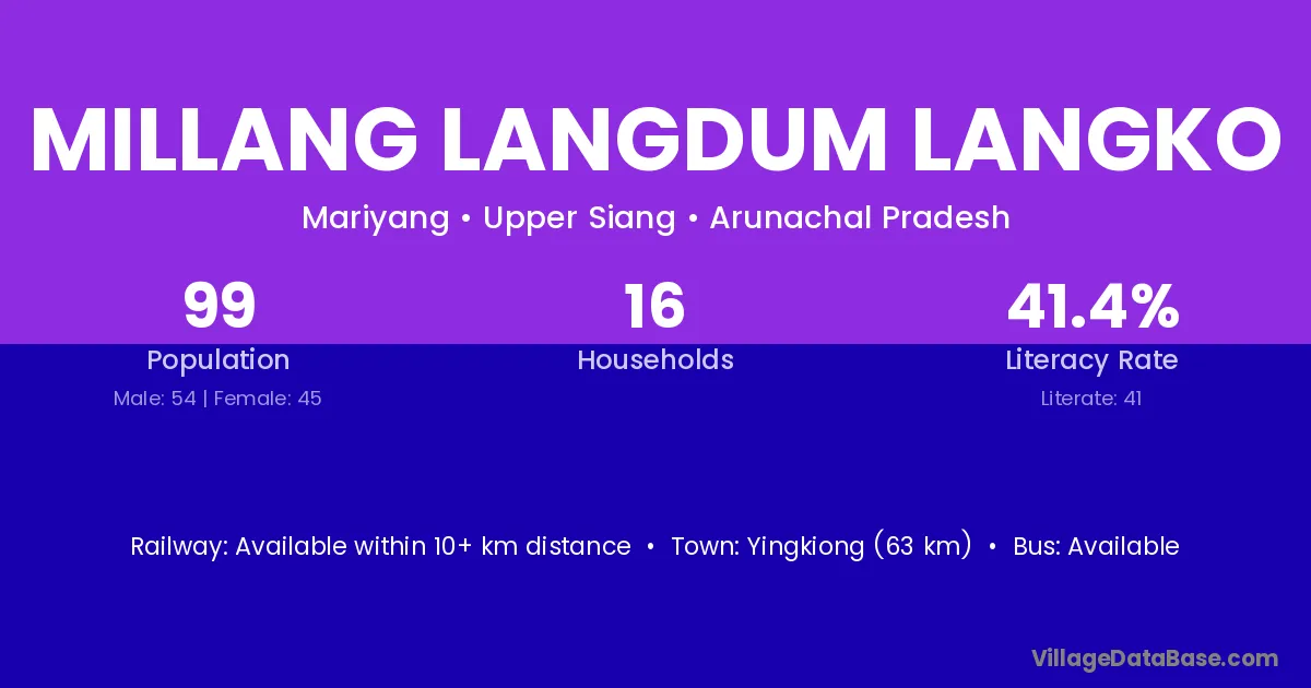 Yingkiong (63 km) is the nearest town to Millang Langdum Langko village for major economic activities and is located approximately 63 km away.