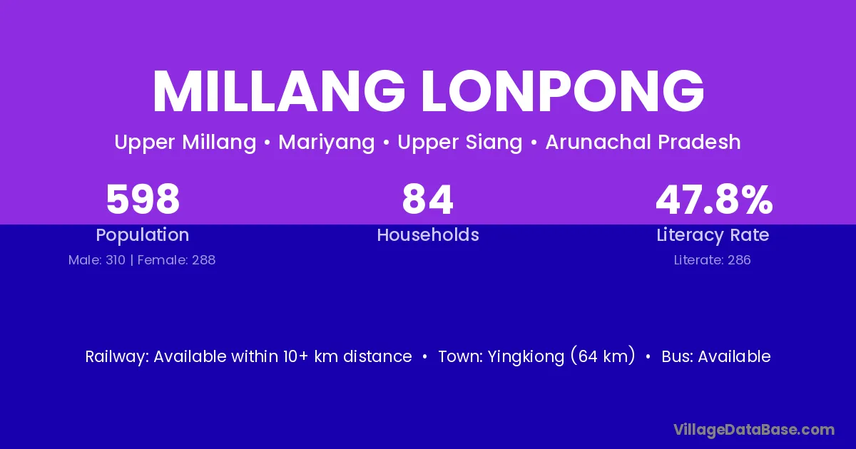 Yingkiong (64 km) is the nearest town to Millang Lonpong village for major economic activities and is located approximately 64 km away.