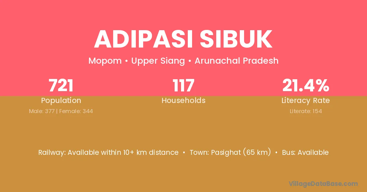Pasighat (65 km) is the nearest town to Adipasi Sibuk village for major economic activities and is located approximately 65 km away.