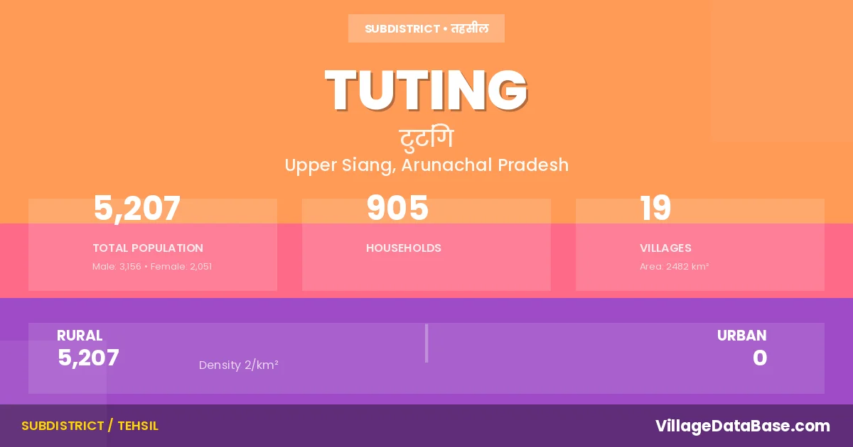 Tuting is a town and Circle in the Upper Siang district of the Arunachal Pradesh. In India, a Circle is a subdivision of a district responsible for the administration and revenue collection of a specific area within the district. Circles play a crucial role in the local governance structure, contributing significantly to the development and administration of their communities.