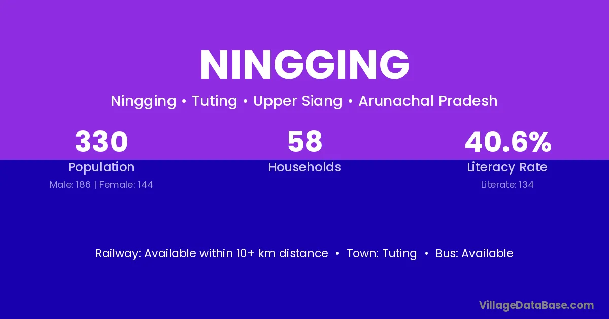 The literacy rate of Ningging village is 40.61%. Male literacy stands at 45.70% and female literacy at 34.03%.