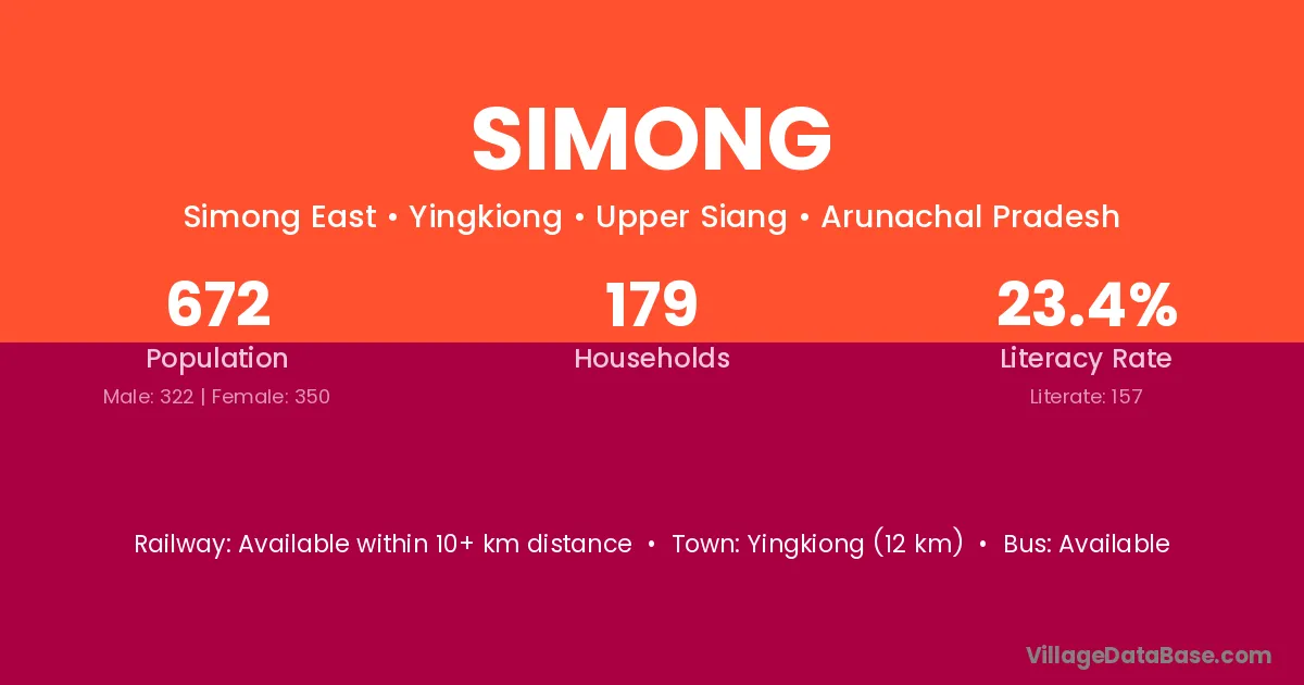 Yingkiong (12 km) is the nearest town to Simong village for major economic activities and is located approximately 12 km away.