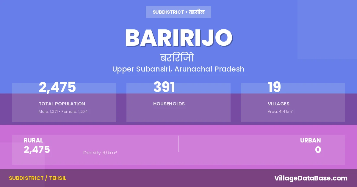 Baririjo is a town and Circle in the Upper Subansiri district of the Arunachal Pradesh. In India, a Circle is a subdivision of a district responsible for the administration and revenue collection of a specific area within the district. Circles play a crucial role in the local governance structure, contributing significantly to the development and administration of their communities.