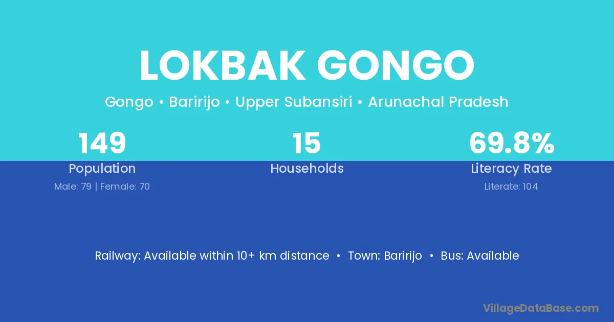 Lokbak Gongo village has a total population of 149 people, of which 79 are males and 70 are females.