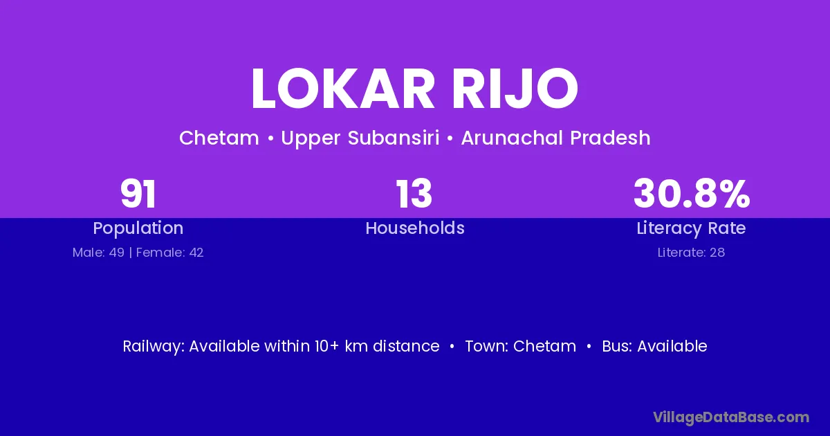 Lokar Rijo village has a total population of 91 people, of which 49 are males and 42 are females.