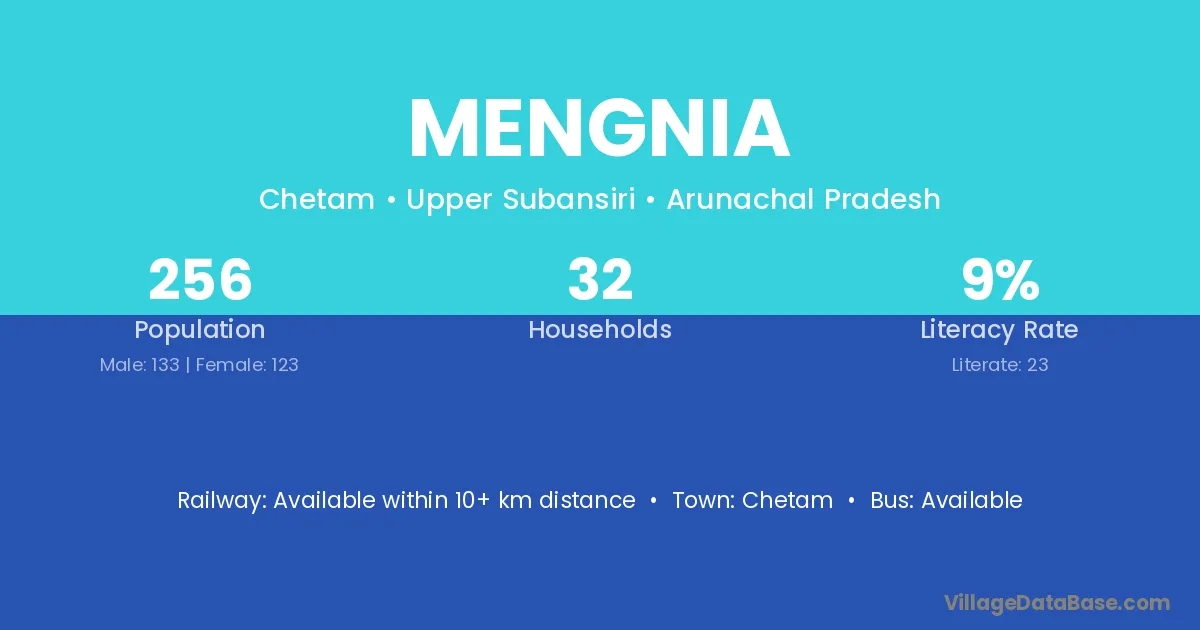 The literacy rate of Mengnia village is 8.98%. Male literacy stands at 12.03% and female literacy at 5.69%.