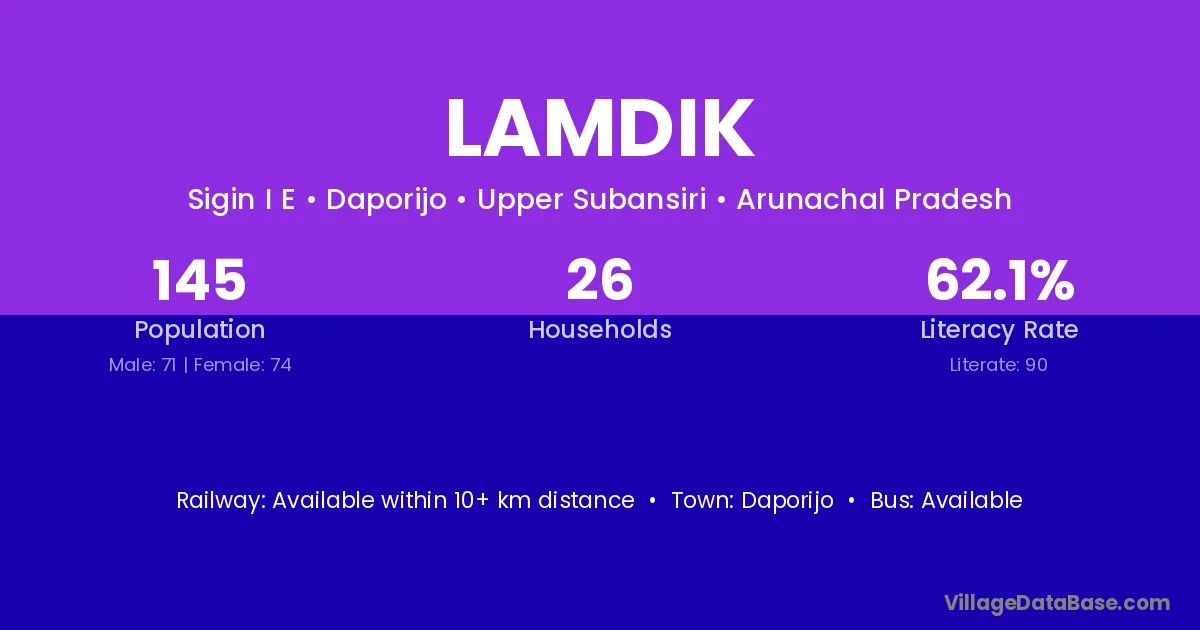 Lamdik village has a total population of 145 people, of which 71 are males and 74 are females.