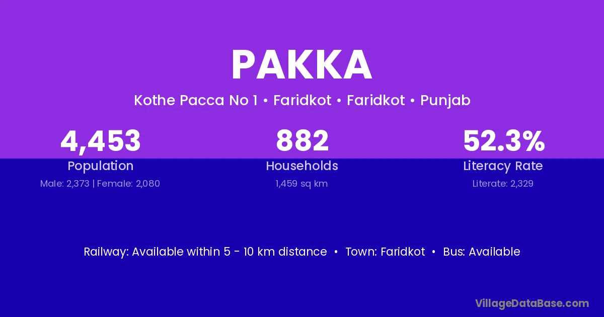 The literacy rate of Pakka village is 68.67%. Male literacy stands at 72.36% and female literacy at 64.55%.