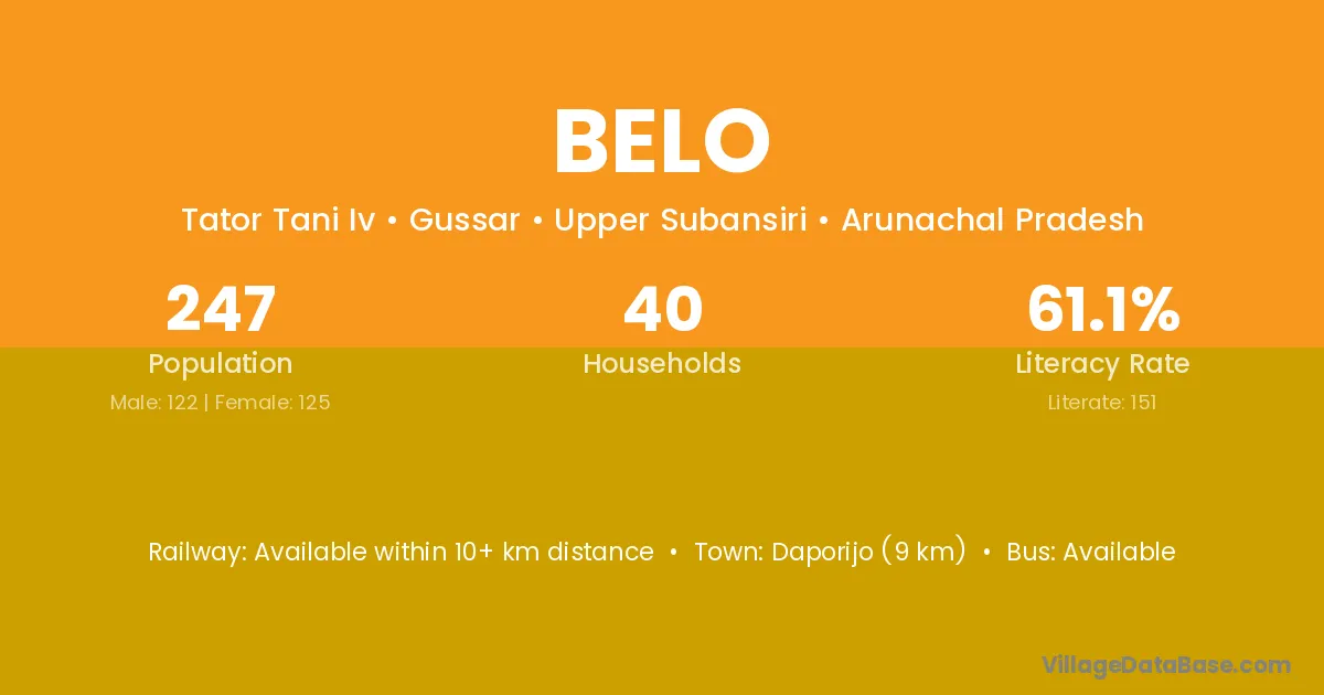 Daporijo (9 km) is the nearest town to Belo village for major economic activities and is located approximately 9 km away.