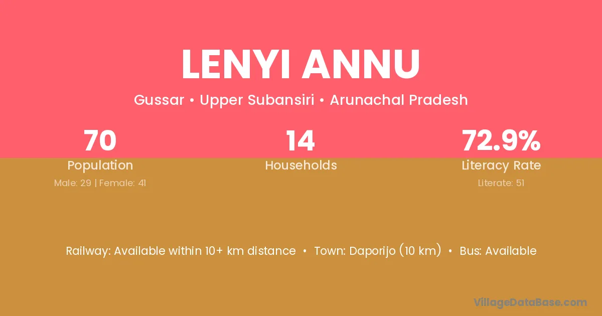 Lenyi Annu village has a total population of 70 people, of which 29 are males and 41 are females.