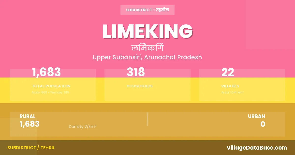 Limeking is a town and Circle in the Upper Subansiri district of the Arunachal Pradesh. In India, a Circle is a subdivision of a district responsible for the administration and revenue collection of a specific area within the district. Circles play a crucial role in the local governance structure, contributing significantly to the development and administration of their communities.