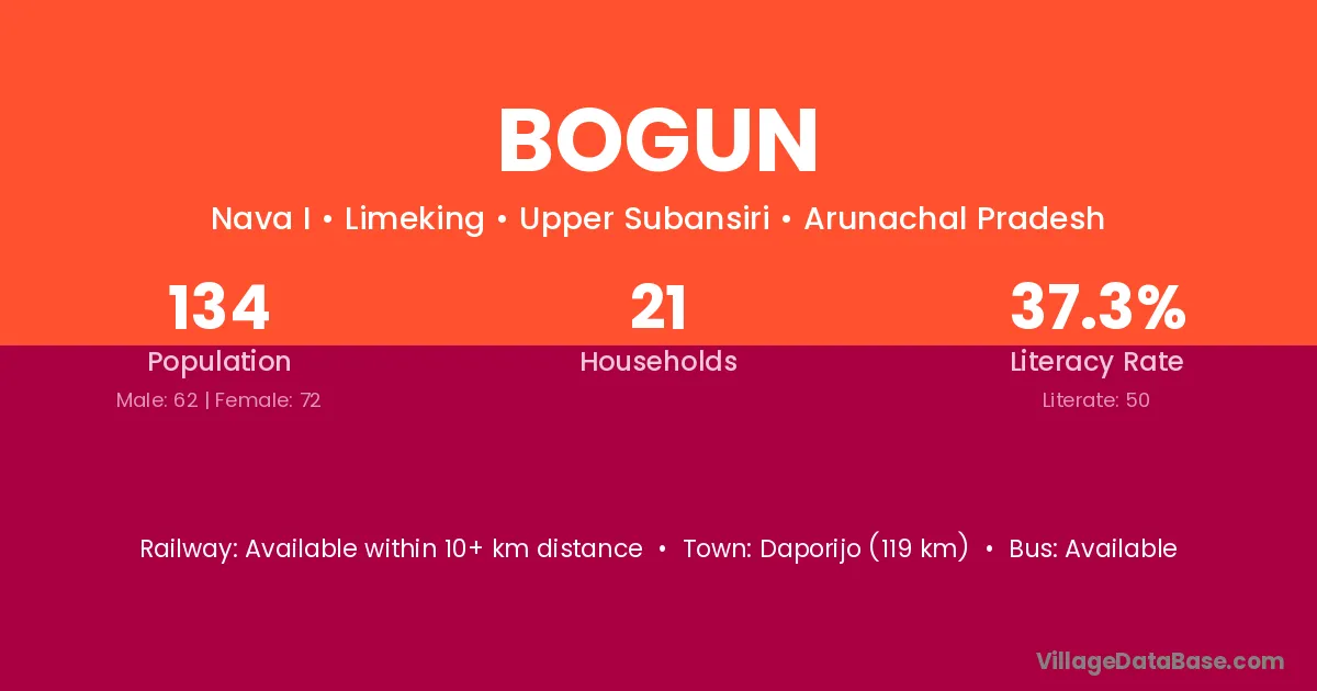 Daporijo (119 km) is the nearest town to Bogun village for major economic activities and is located approximately 119 km away.