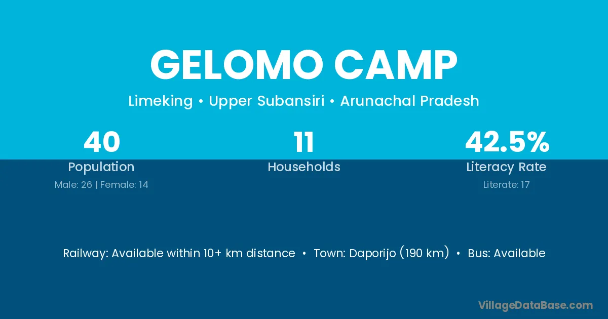 Daporijo (190 km) is the nearest town to Gelomo Camp village for major economic activities and is located approximately 190 km away.