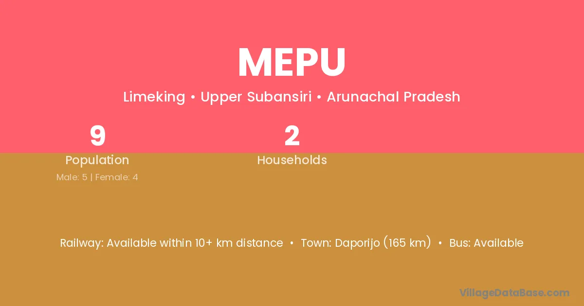 Mepu village has a total population of 9 people, of which 5 are males and 4 are females.