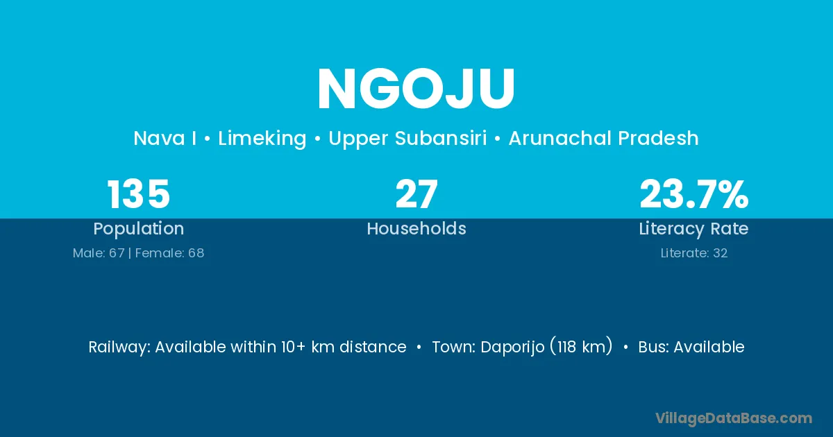 Daporijo (118 km) is the nearest town to Ngoju village for major economic activities and is located approximately 118 km away.