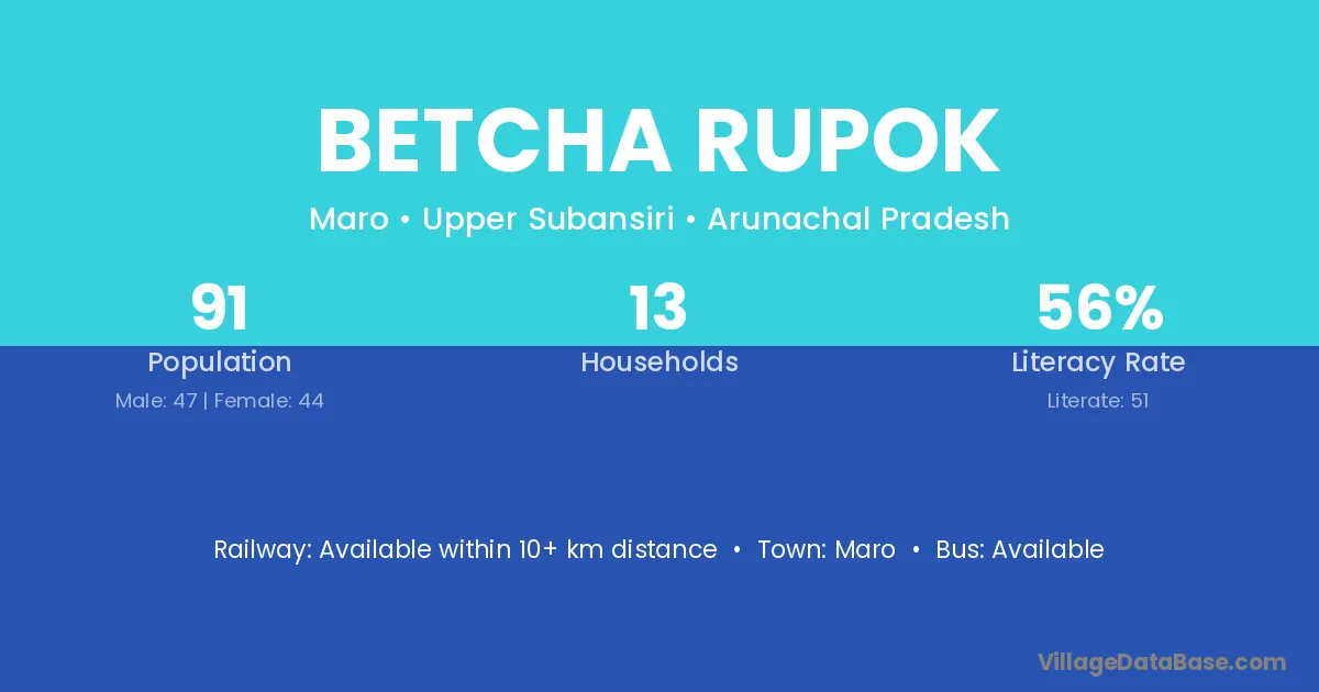 Betcha Rupok village has a total population of 91 people, of which 47 are males and 44 are females.