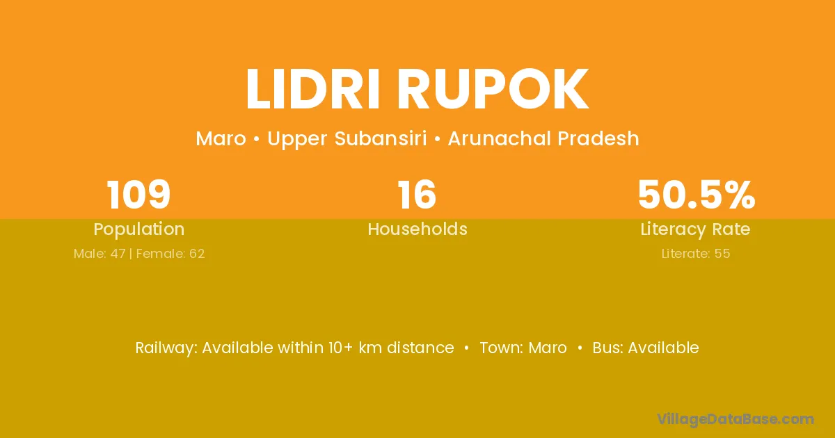 Lidri Rupok village has a total population of 109 people, of which 47 are males and 62 are females.