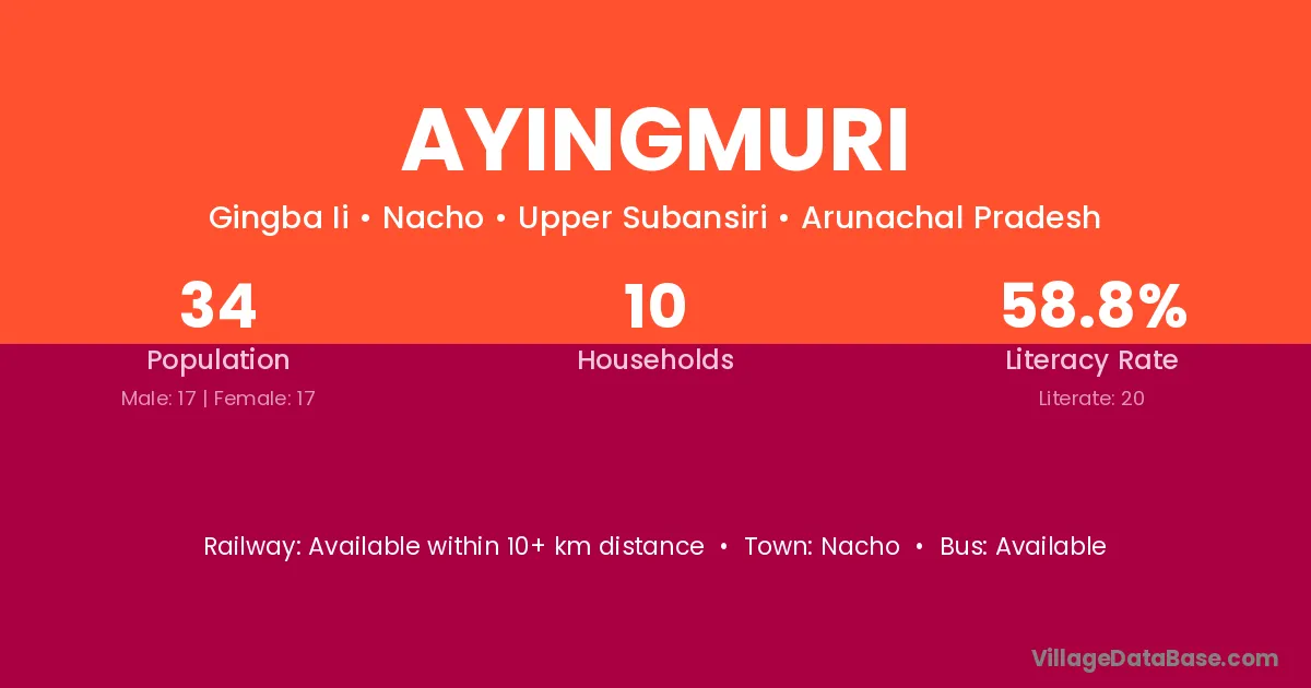 Ayingmuri village has a total population of 34 people, of which 17 are males and 17 are females.