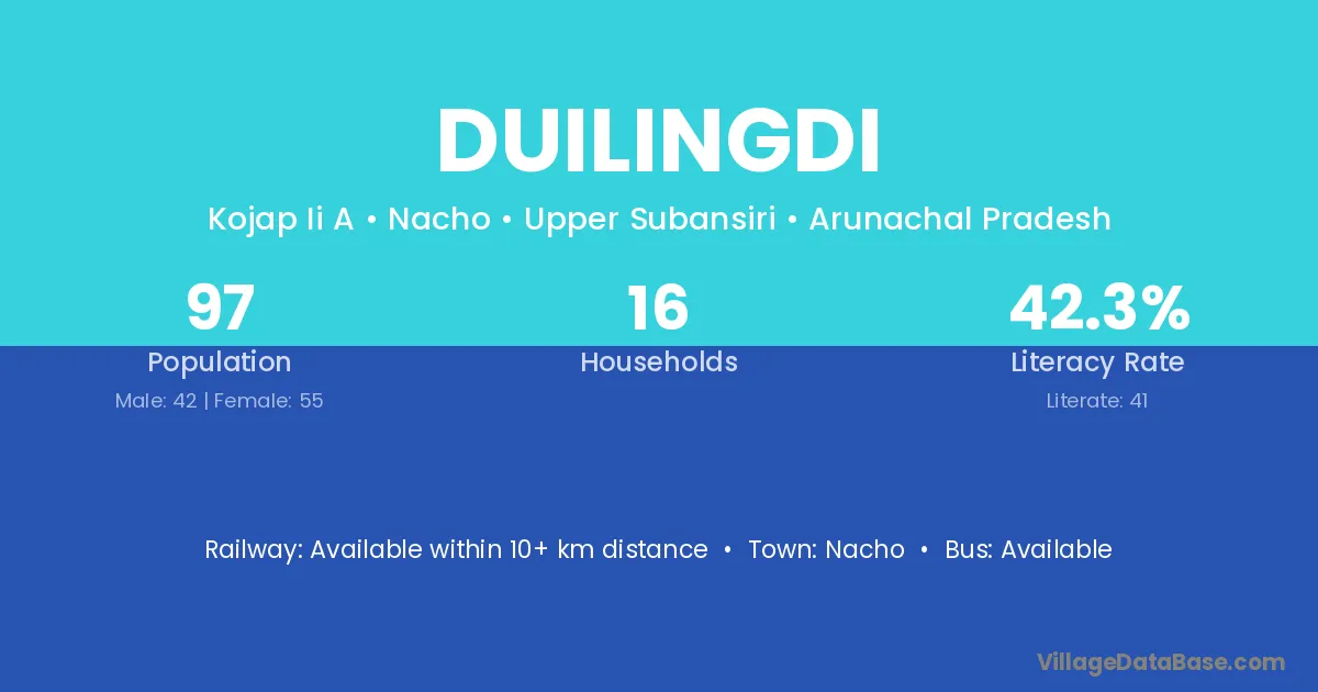 Duilingdi village has a total population of 97 people, of which 42 are males and 55 are females.
