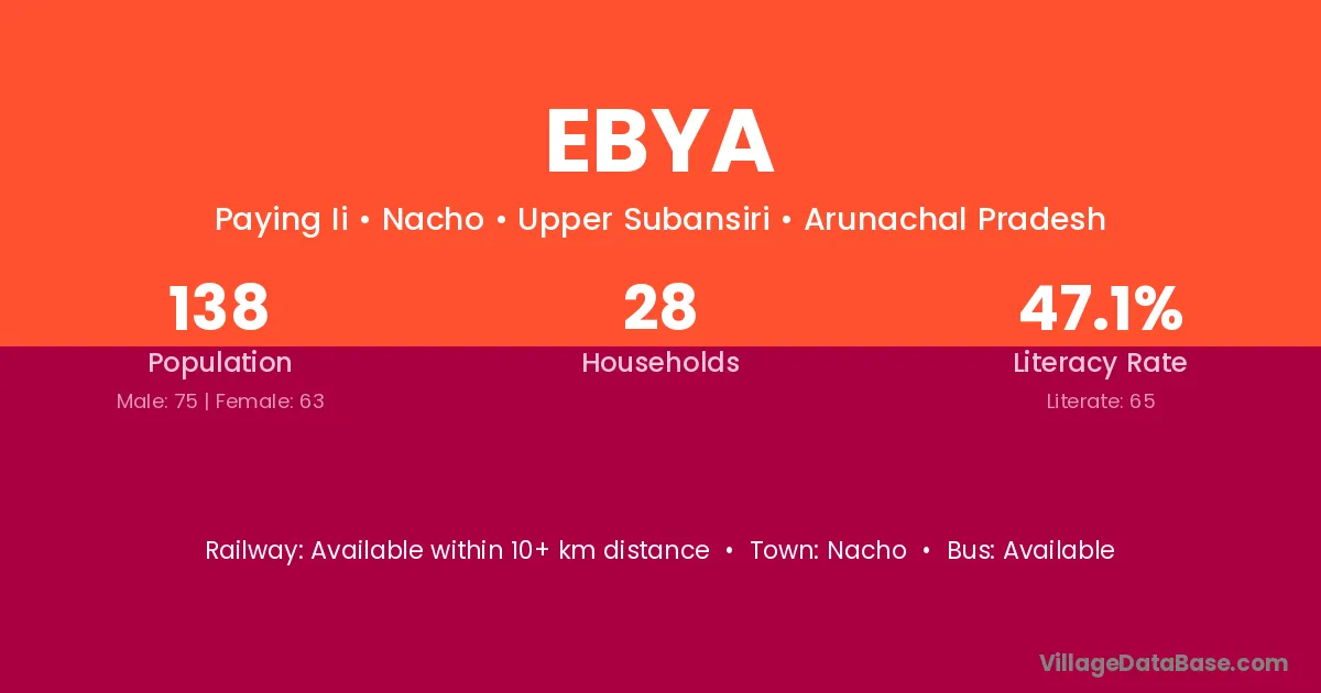 Ebya village has a total population of 138 people, of which 75 are males and 63 are females.