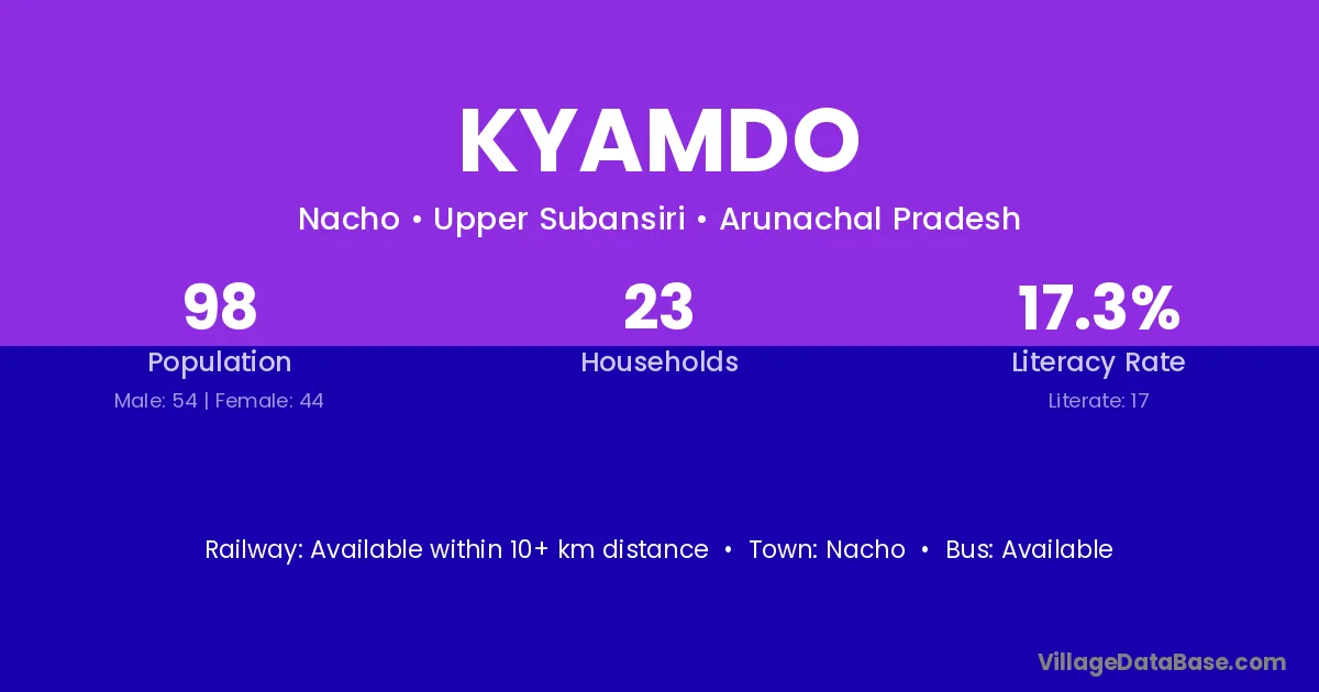 Kyamdo village has a total population of 98 people, of which 54 are males and 44 are females.