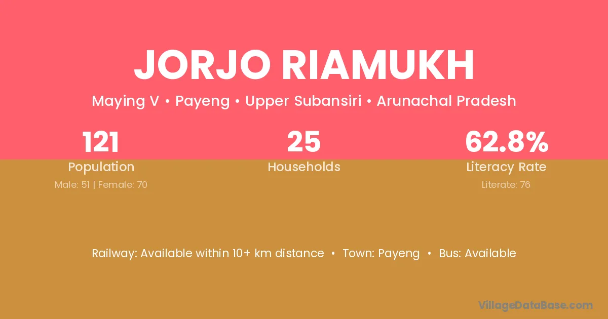 Jorjo Riamukh village has a total population of 121 people, of which 51 are males and 70 are females.