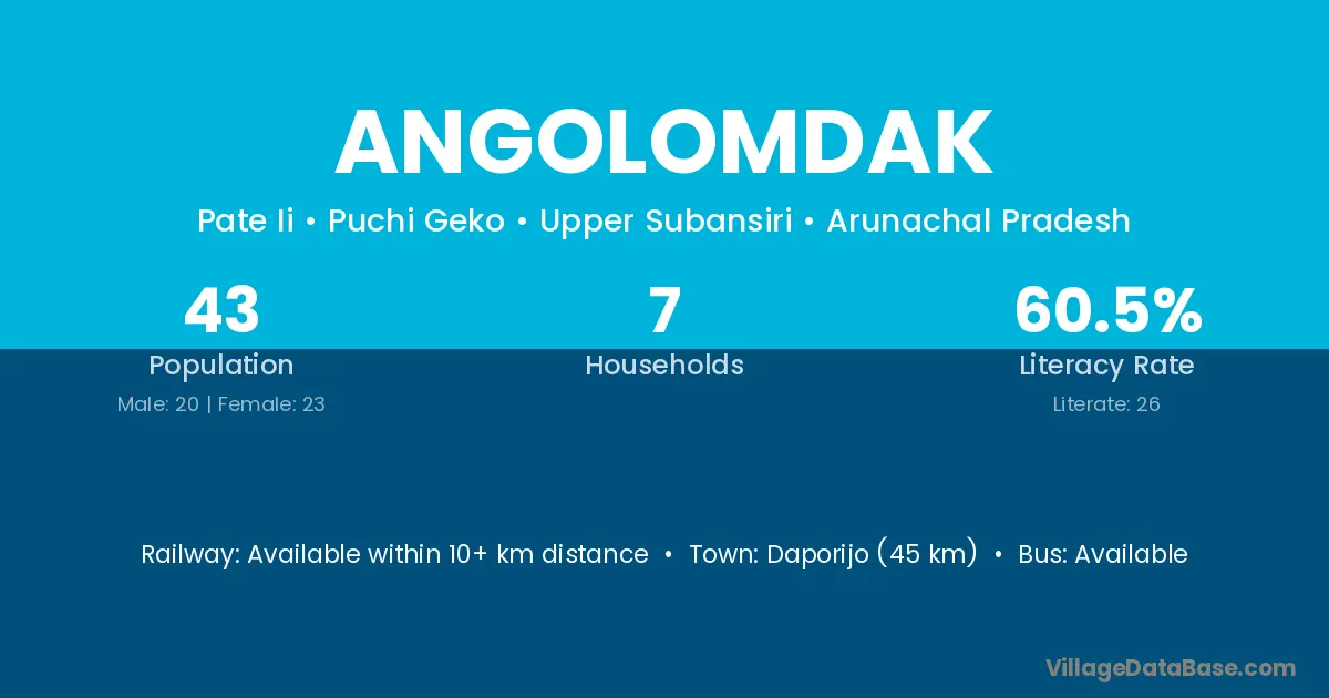 Daporijo (45 km) is the nearest town to Angolomdak village for major economic activities and is located approximately 45 km away.