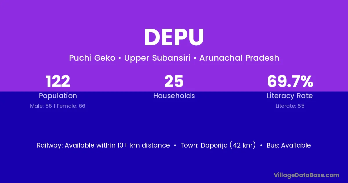 Daporijo (42 km) is the nearest town to Depu village for major economic activities and is located approximately 42 km away.