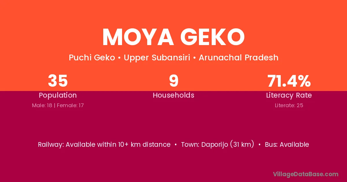 Daporijo (31 km) is the nearest town to Moya Geko village for major economic activities and is located approximately 31 km away.