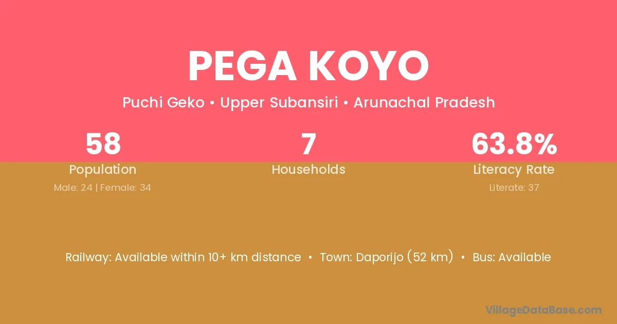Daporijo (52 km) is the nearest town to Pega Koyo village for major economic activities and is located approximately 52 km away.