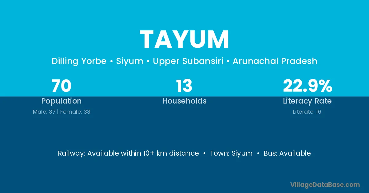 Tayum village has a total population of 70 people, of which 37 are males and 33 are females.