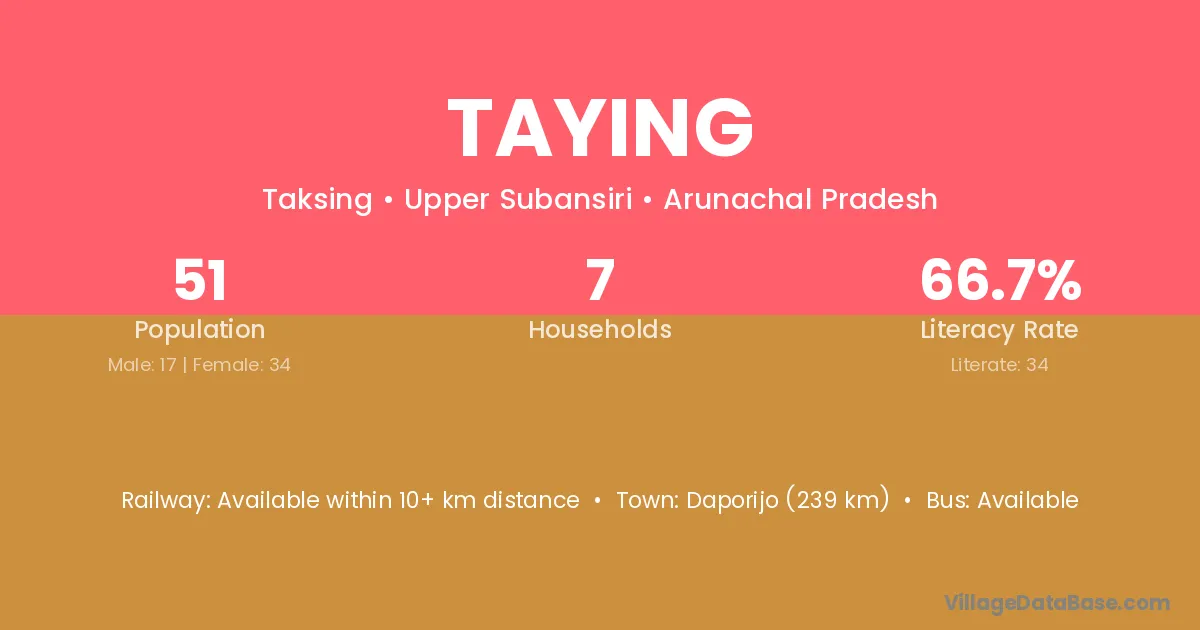 Taying village has a total population of 51 people, of which 17 are males and 34 are females.