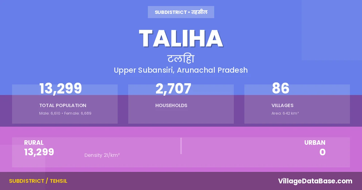 Taliha is a town and Circle in the Upper Subansiri district of the Arunachal Pradesh. In India, a Circle is a subdivision of a district responsible for the administration and revenue collection of a specific area within the district. Circles play a crucial role in the local governance structure, contributing significantly to the development and administration of their communities.