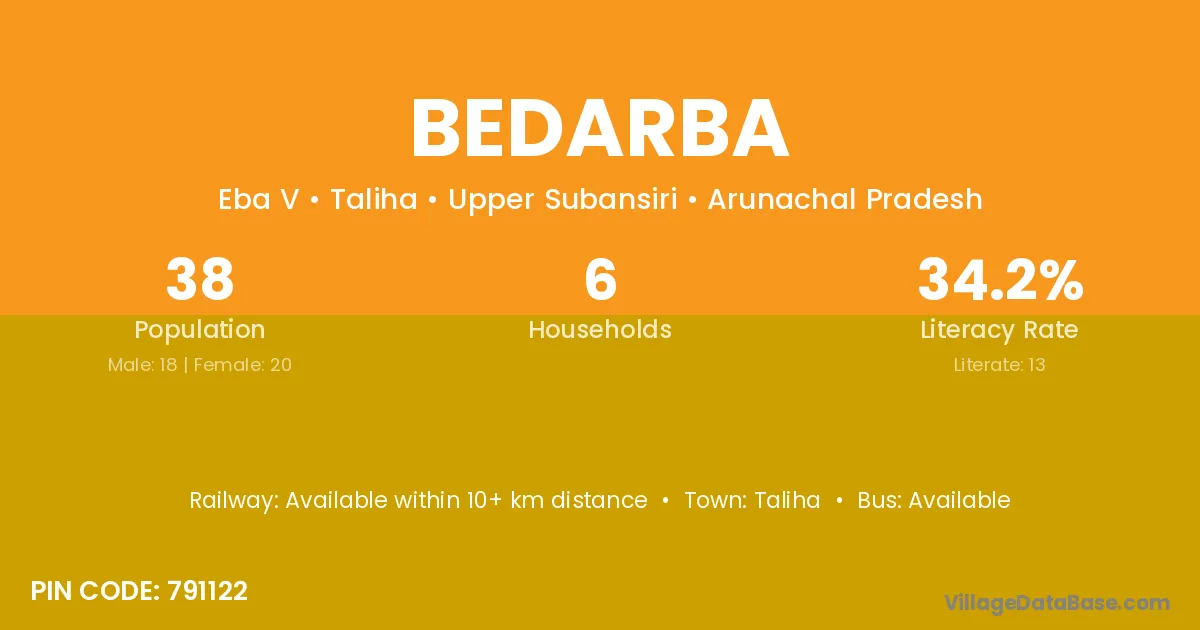 Bedarba village has a total population of 38 people, of which 18 are males and 20 are females.
