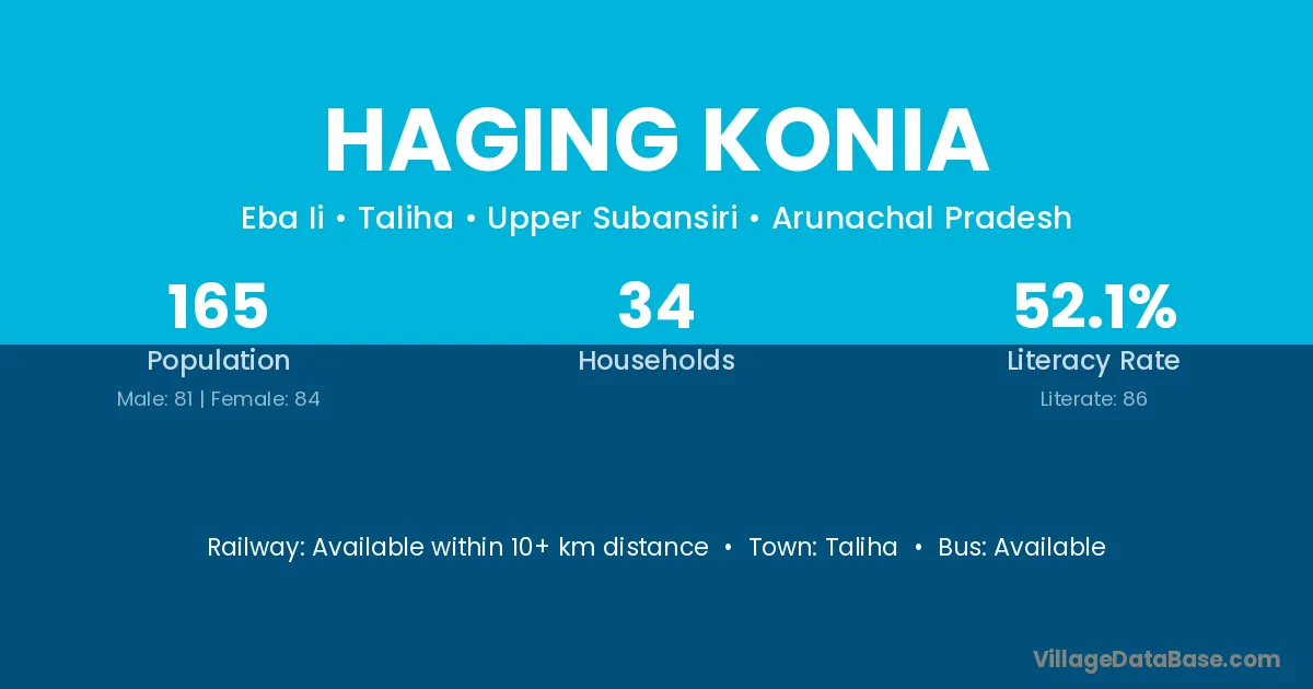 Haging Konia village has a total population of 165 people, of which 81 are males and 84 are females.
