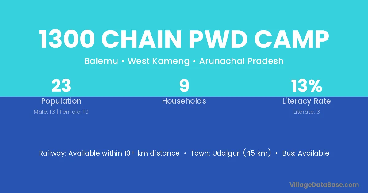 Udalguri (45 km) is the nearest town to 1300 Chain Pwd Camp village for major economic activities and is located approximately 45 km away.