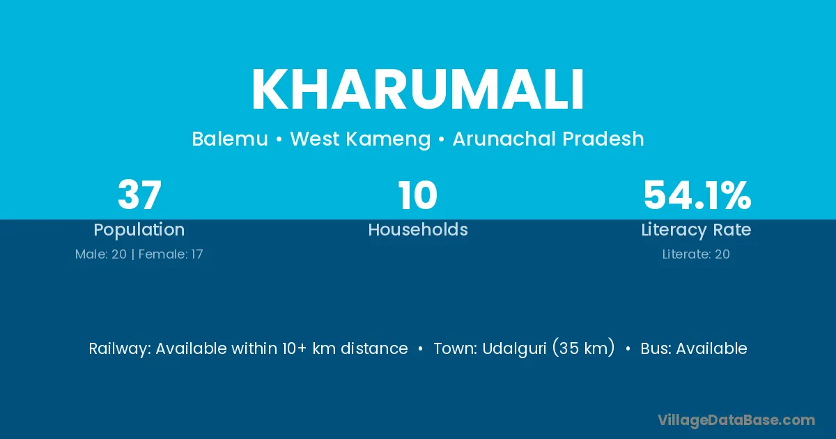 Kharumali village has a total population of 37 people, of which 20 are males and 17 are females.