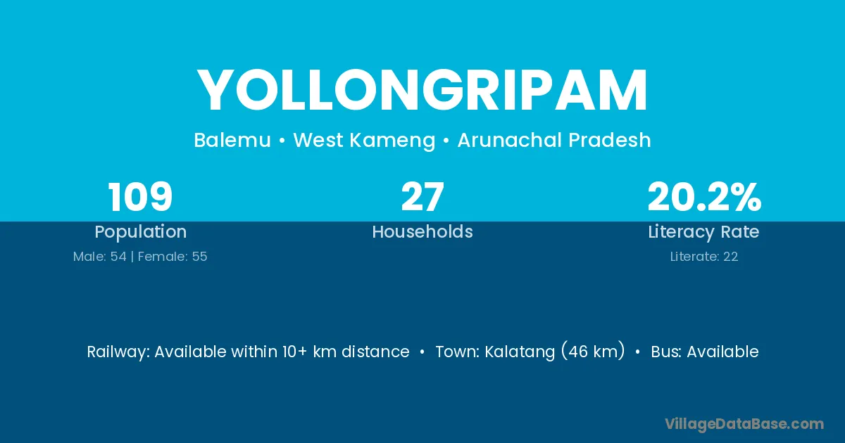 Yollongripam village has a total population of 109 people, of which 54 are males and 55 are females.