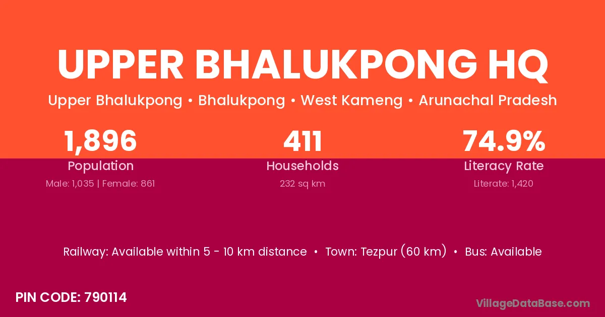 Upper Bhalukpong Hq village has a total population of 1,896 people, of which 1,035 are males and 861 are females.