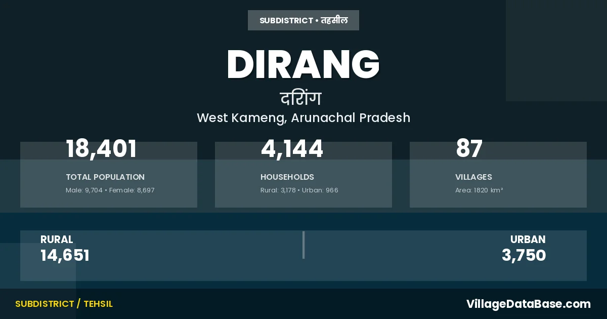 According to the 2011 census The total area of Dirang Circle is 1820 km², with a population of 18401 people. The population density is 10 inhabitants per square kilometre, and there are approximately 4144 houses in the sub district.