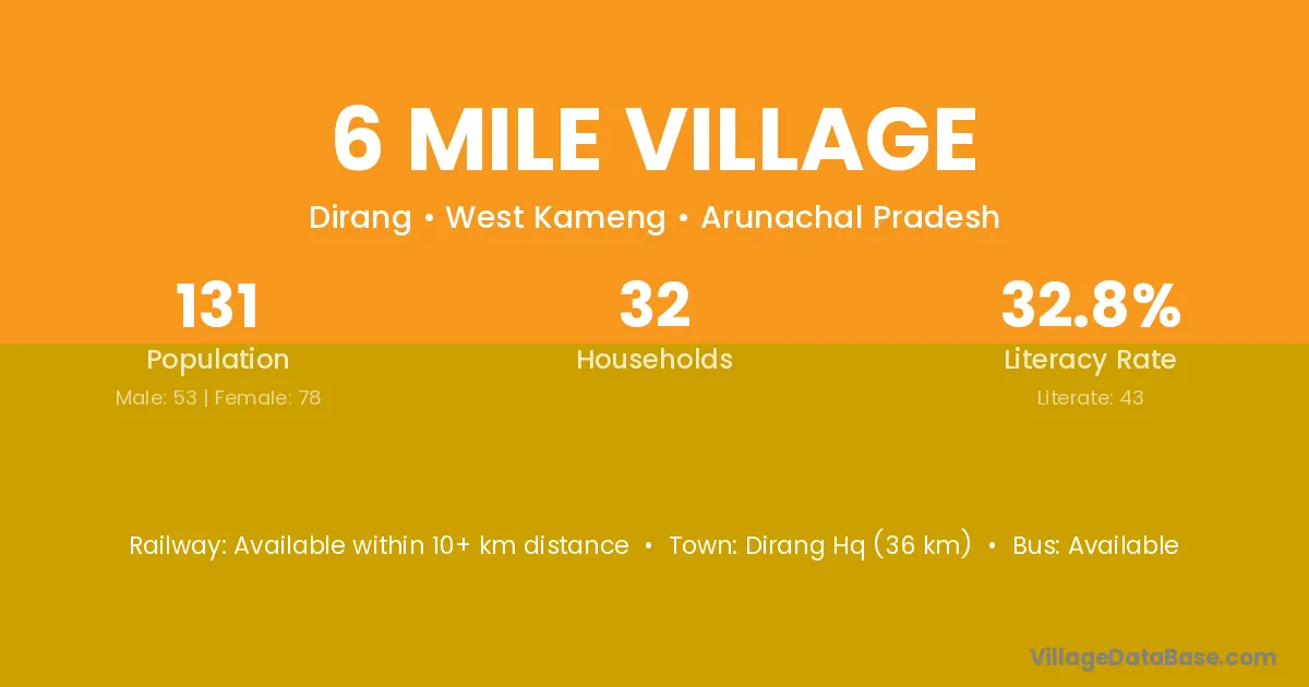 Dirang Hq (36 km) is the nearest town to 6 Mile Village village for major economic activities and is located approximately 36 km away.