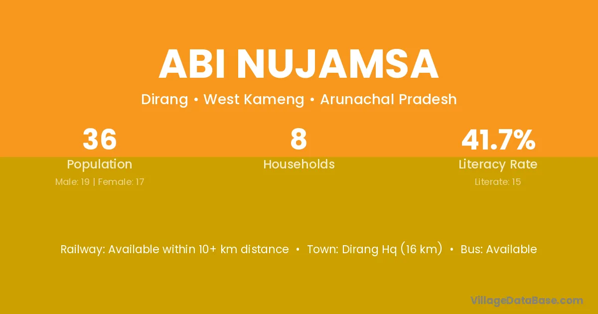 Dirang Hq (16 km) is the nearest town to Abi Nujamsa village for major economic activities and is located approximately 16 km away.