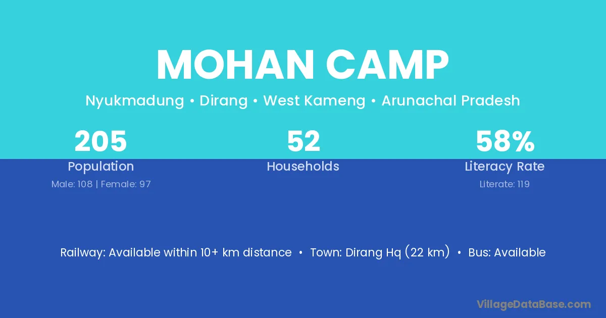 Dirang Hq (22 km) is the nearest town to Mohan Camp village for major economic activities and is located approximately 22 km away.