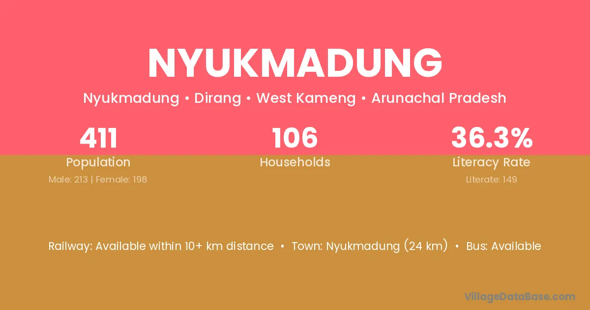 Nyukmadung village has a total population of 411 people, of which 213 are males and 198 are females.